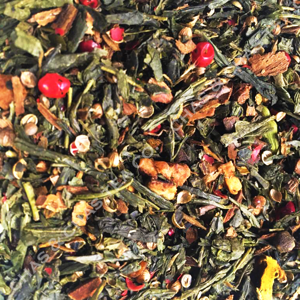 Té verde Sencha, naranja, vainilla, cardamomo, canela, clavo y pimienta roja.